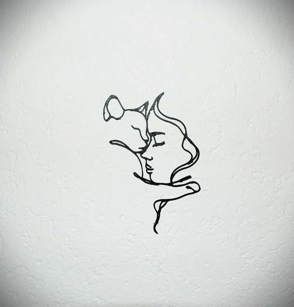 Ta čutna stenska dekoracija prikazuje nežno povezanost med žensko in mačko v elegantnem linijskem slogu. Idealna izbira za ljubitelje mačk, ki želijo izraziti svojo ljubezen do živali tudi skozi umetnost doma. Minimalistična izvedba v 3D obliki doda prostoru toplino, značaj in sodoben umetniški pridih. Odlična za dnevno sobo, spalnico, hodnik ali kot unikatno darilo.