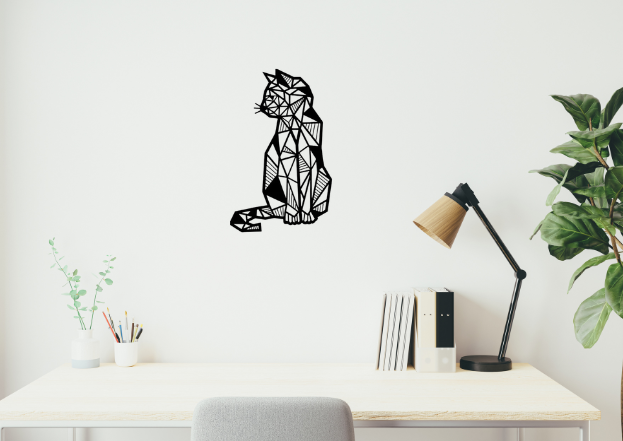 Ta sodobna 3D stenska dekoracija v obliki geometrijske mačke takoj pritegne poglede z edinstvenim polygonalnim vzorcem, ki združuje ostrino linij in igrivost oblike.